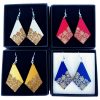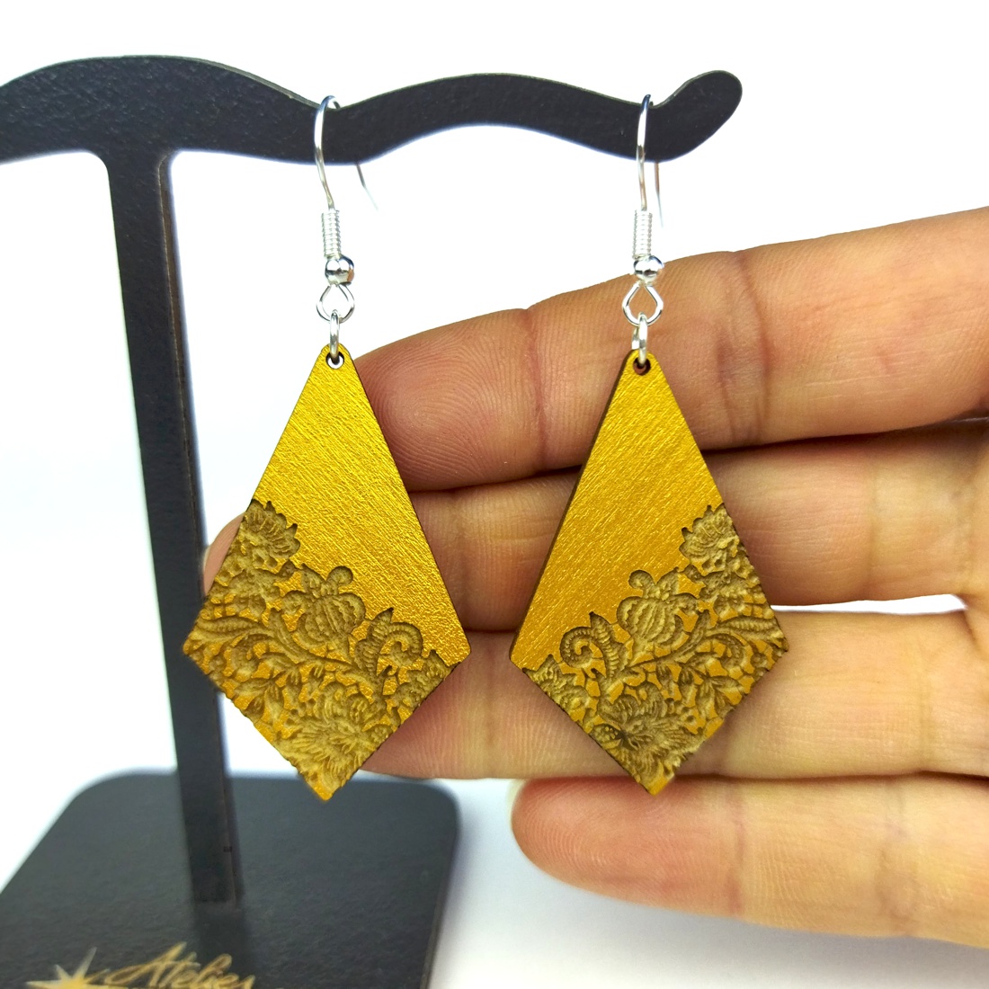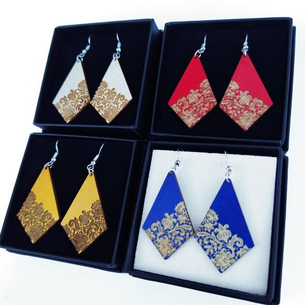 Les boucles d’oreilles dentelle sont disponibles en finition bois brut, doré, argent, rouge et bleu outremer.